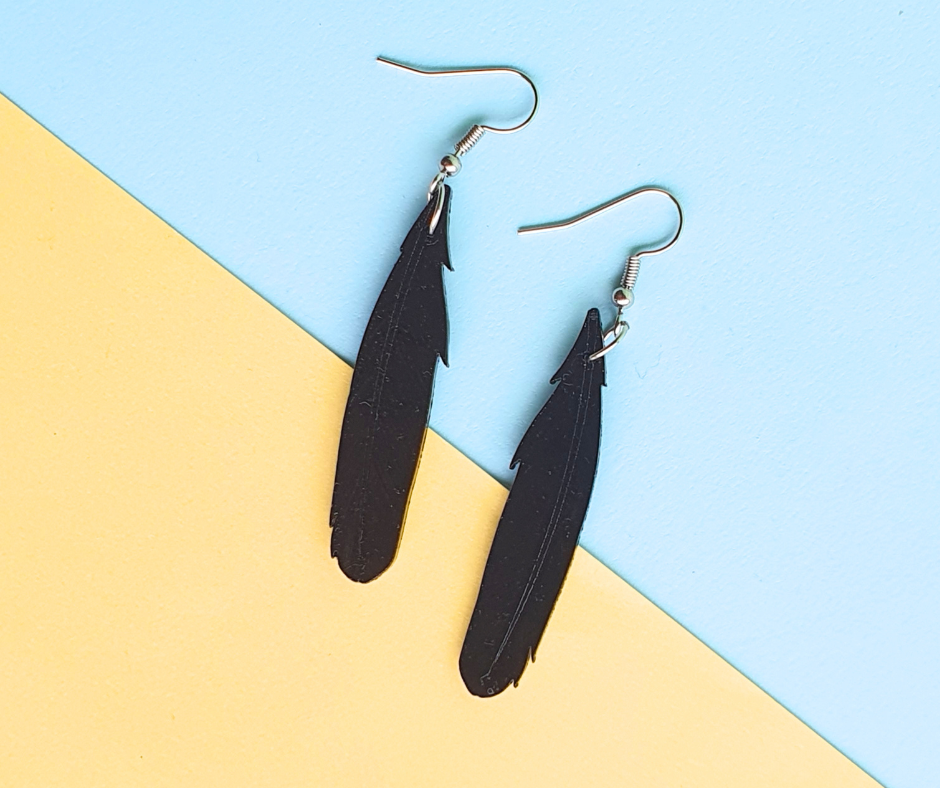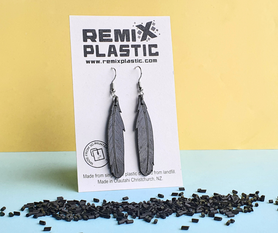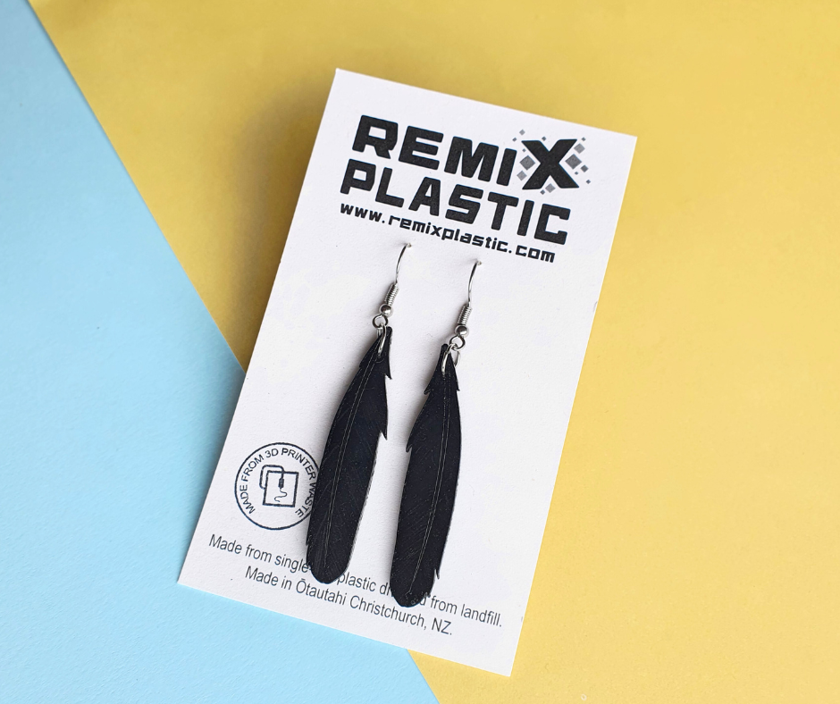 These earrings are made from 3D printer waste and every feather is different! The plastic is sourced from Kiwifil, another NZ recycling company and is material they couldn't use.