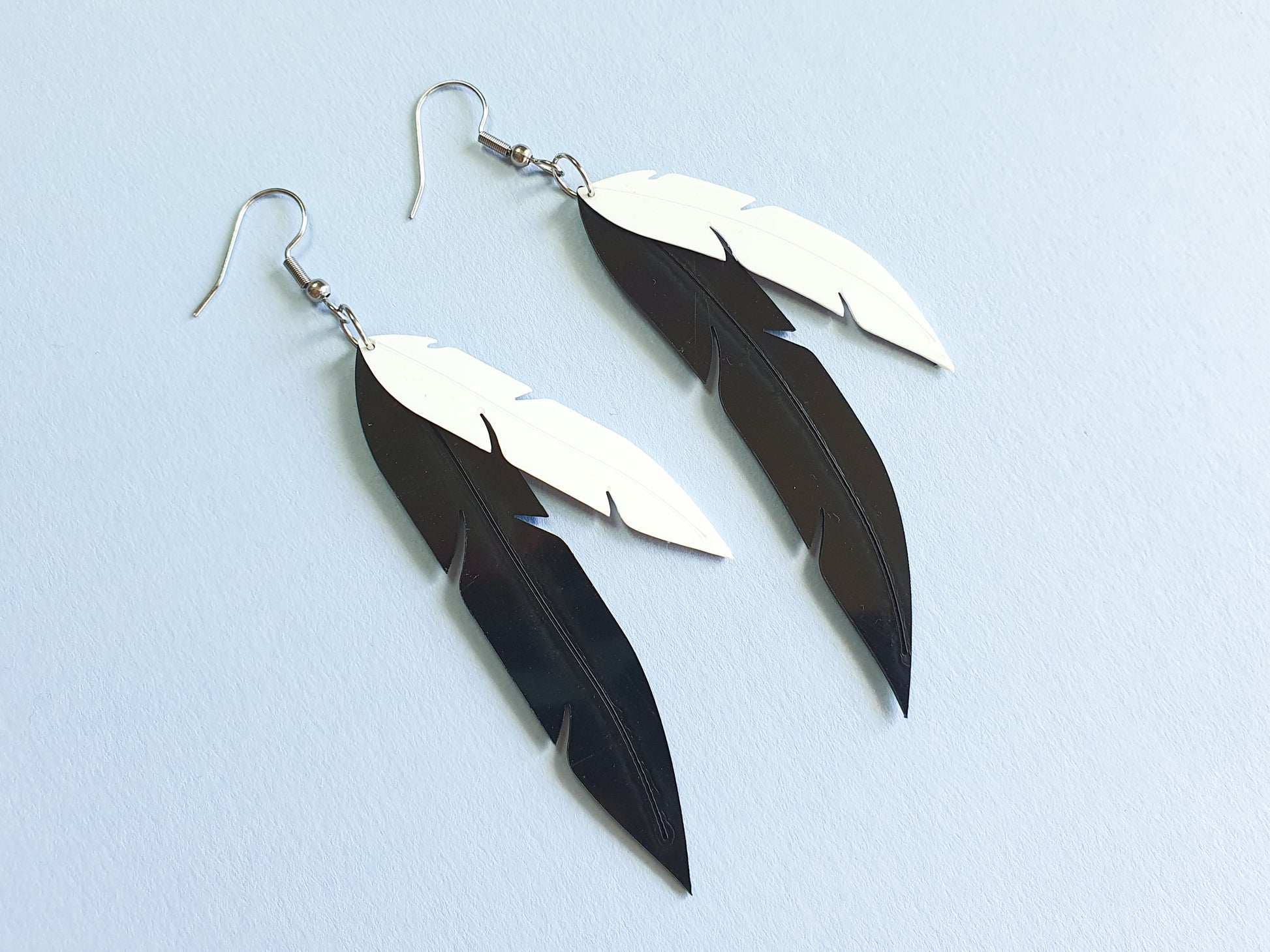 Introducing our statement black and white layered feather earrings, inspired by the New Zealand Pied Cormorant! These earrings are laser-cut from recycled ice cream container lids, diverted from landfill and transformed into a beautiful and unique accessory.