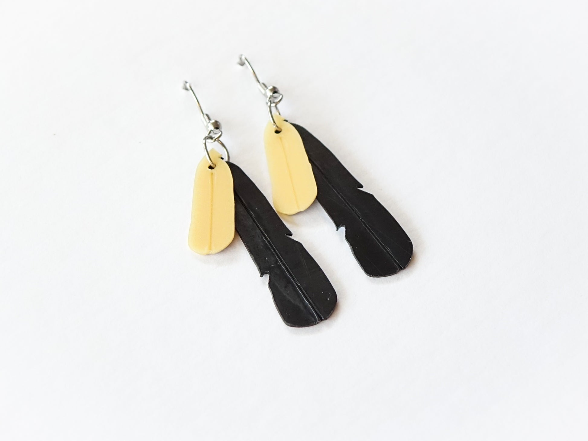 These duel feather earrings are made from gold and black ice cream container lids and drape over one another like the tail feathers of the Saddleback.